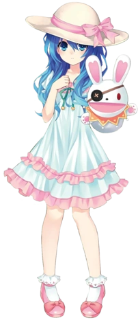 Yoshino has the appearance of a young, cute girl at about 13 to 14 years of age with blue eyes and long curly blue hair. She wears a white short dress under a large green raincoat that has a tail with a pink ribbon attached to it, with a pair of rabbit-ear hood and holds her rabbit puppet, Yoshinon, in her left hand. Her preferred form of clothing appears to be sun dresses along with boots that match her raincoat. Yoshino's height is stated to be 144cm, and her three sizes are B73/W55/H78