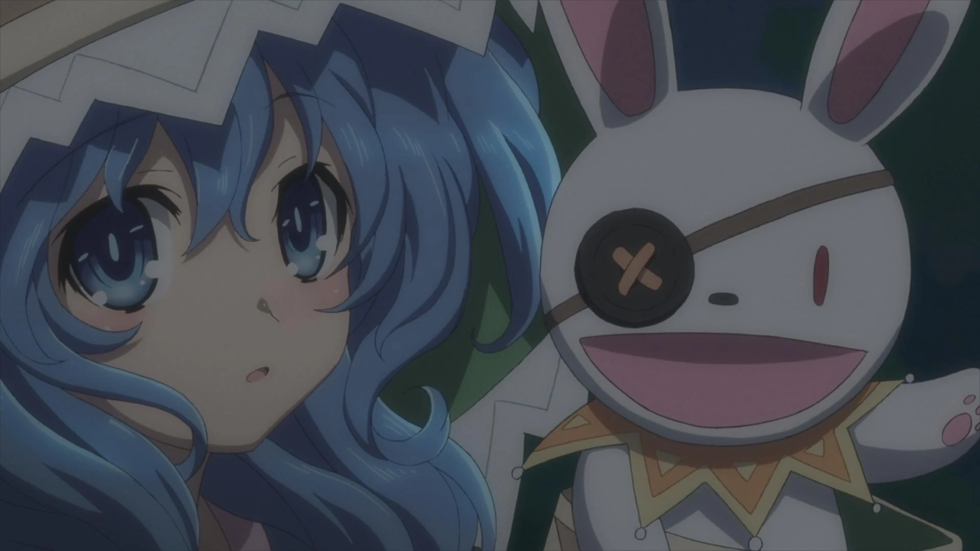 As Yoshino enters the world, her arrival causes it to rain. She is seen dancing in the rain as Shido bumps into her after coming back from school. As she trips and falls down, Shido tries to help her, but she takes several steps back. With her body trembling, she asks him to not come closer, telling him that she doesn’t want him to hurt her. As Shido notices a puppet on the ground, he decides to ask if it is hers. Seeing that the girl was still cautious, Shido dropped the puppet on the ground and allowed her to retrieve it. After picking up the puppet, the girl uses it to call Shido a lucky pervert before saying good-bye and running away.